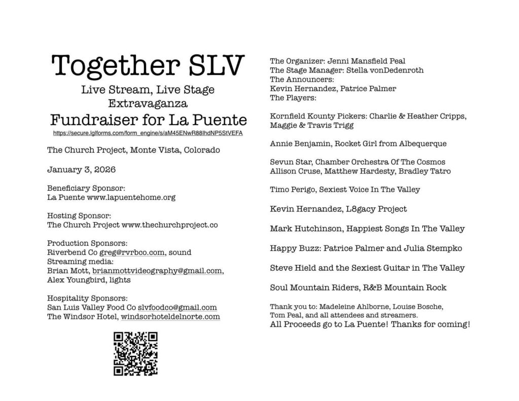 In response to the threat of food insecurity in the San Luis Valley in the winter of 2025-2026, , a coalition of performance artists led by Jenni Mansfield Peal produced two evenings of concert performance. January 2, hosted by Trade & Post in Del Norte, Annie Benjamin of Albequerque joined Jenni for a songwriter in the round concert. The next evening, January 3, nine acts appeared at Together SLV Live Stream, Live Stage Extravaganza Fundraiser for La Puente, hosted by The Church Project in Monte Vista.